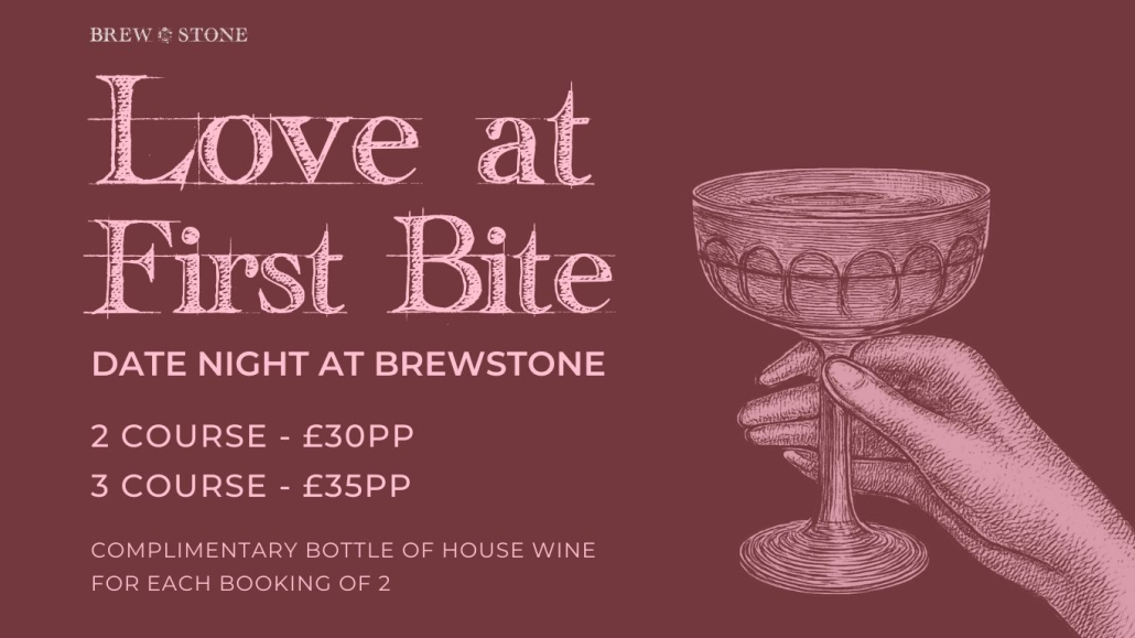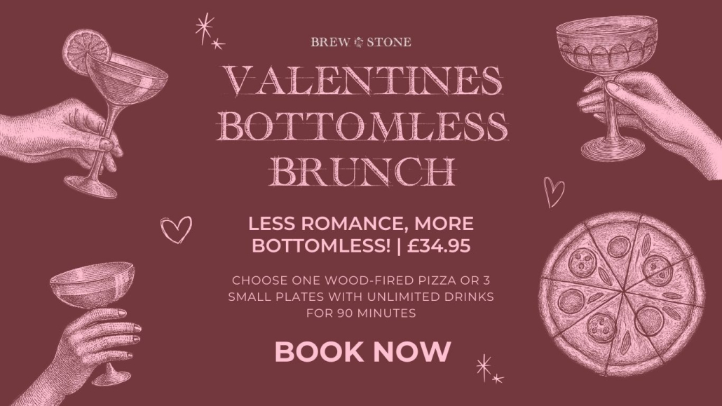 Valentine’s Bottomless Brunch at BrewStone for those who prefer fun over formality, Valentine’s Bottomless Brunch is all about indulgence. Priced at £34.95 per person, choose either one wood-fired pizza or three small plates, paired with unlimited drinks for 90 minutes. Less romance, more bottomless – it’s the perfect way to celebrate Valentine’s with friends, laughter and plenty of fizz.